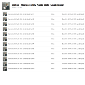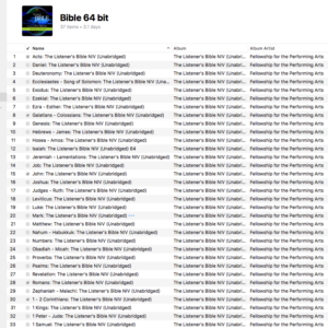 With the Bible, the need for the correct metadata is much more important than any novel, as The Listener’s Bible, narrated by Max McLean will show. Happily, on a laptop as viewed in iTunes, the Biblical book names are visible (and this is all I’m asking for on mobile devices). Here they are sorted alphabetically, which is fine; it would be nice if one could sort them according to the order one finds them in the Bible (but that is truly dispensable):